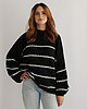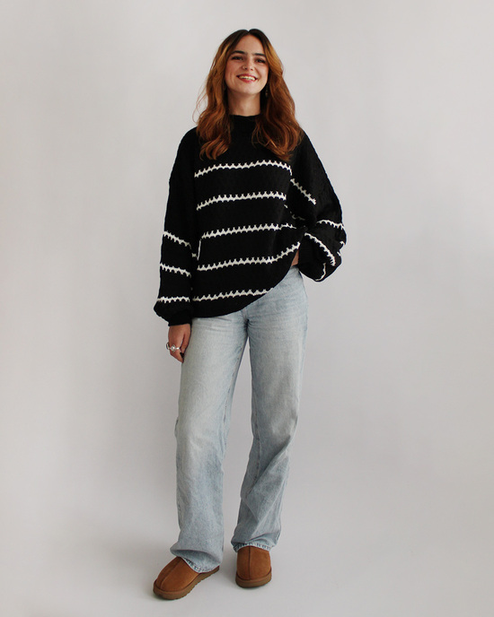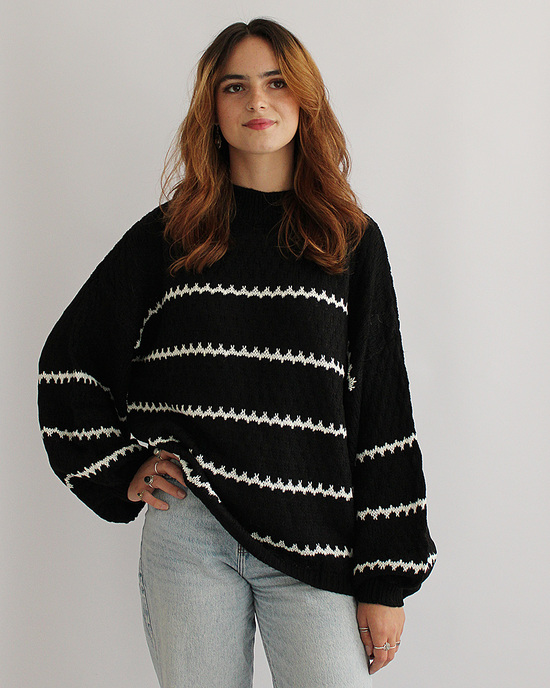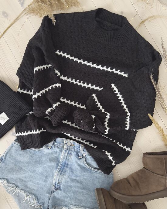 Trendy oversized knitted sweater in black with pattern. Great knitting pattern with extra overlapping shoulders. Long, voluminous sleeves with tight cuffs.