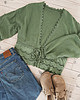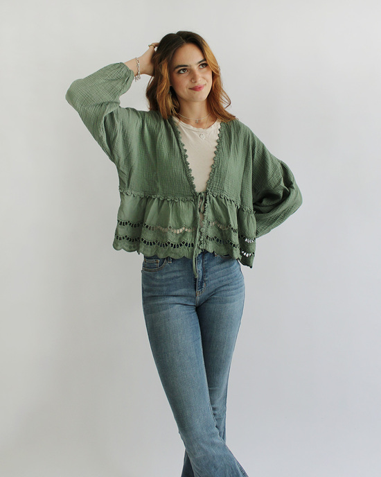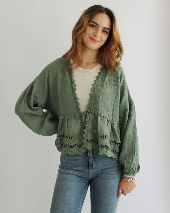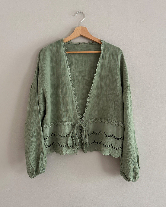 This gorgeous muslin blouse is truly a dream. The color is a beautiful, natural gray-green shade that’s easy to mix and match, as it’s not too bright but still adds a touch of color.
